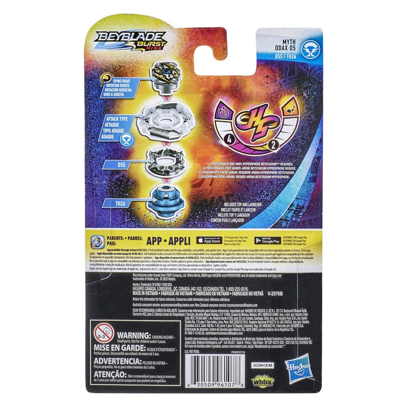 - BEYBLADE BURST COMPETITIVE BATTLING TOP: Includes right-spin Beyblade Burst Rise Hypersphere Myth Odax O5 D55 TH26 attack type top and Hypersphere left/right-spin launcher