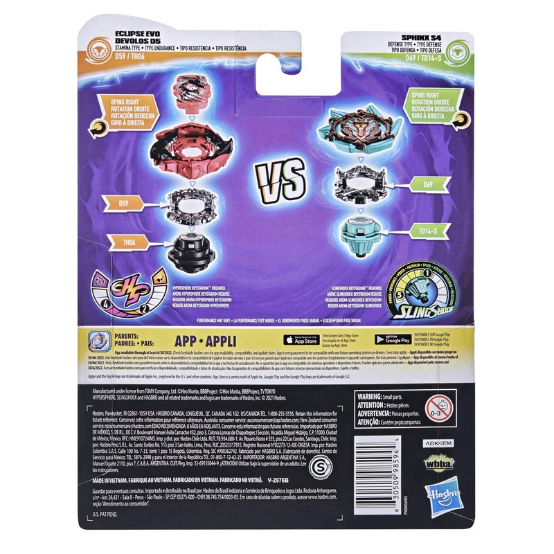 - 2 SPINNING TOPS FOR BEYBLADE BURST BATTLES: Includes Beyblade Burst Surge right-spin Hypersphere Eclipse Evo Devolos D5 D59 TH06 stamina top, Slingshock Sphinx S4 D69 TD14-S defense top