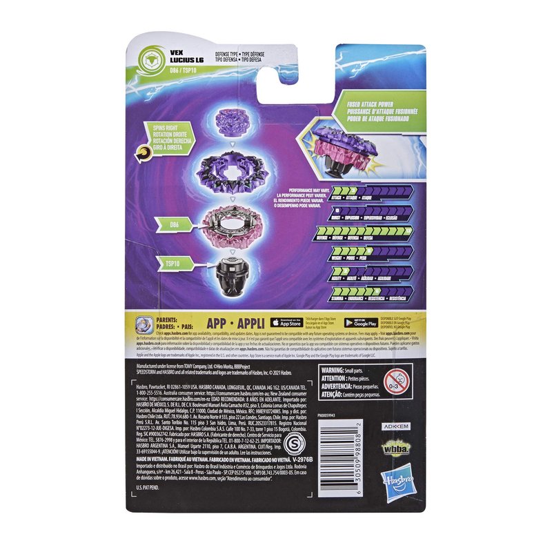 - SPINNING TOP FOR BEYBLADE BURST BATTLES: Includes right-spin Beyblade Burst Surge Speedstorm Vex Lucius L6 D86 TSP10 defense type top and launcher