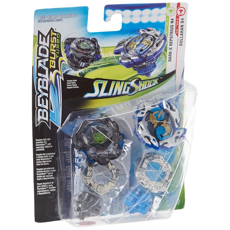 - 2 Beyblade burst competitive battling tops: includes right-spin Beyblade burst turbo slingshock dullahan D4 D48 tb08-s – balance Type – and dark-x nepstrius N4 D47 td01-s – defense Type.