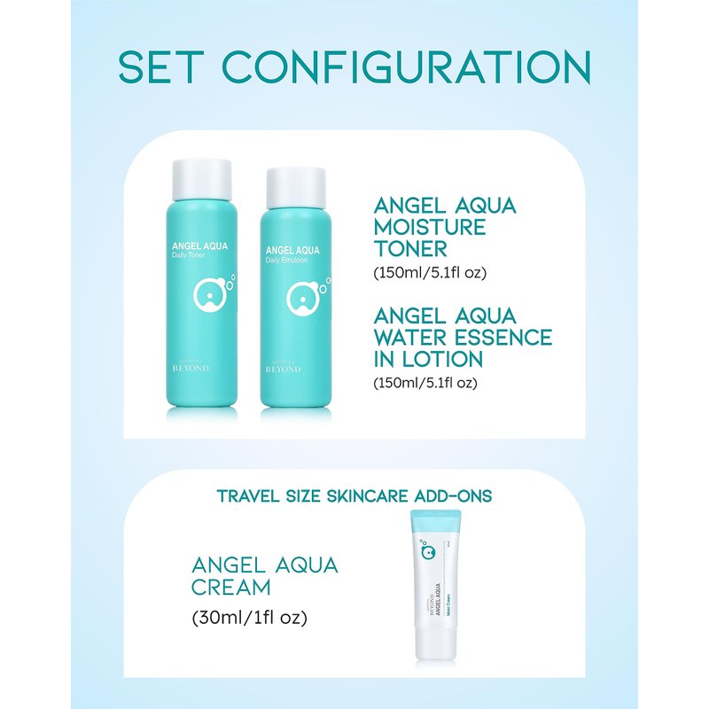 BEYOND Angel Aqua Moisture Skincare Set (Skincare Set, 11.2fl oz , 3-Piece Set) - Vegan Formula Korean Skin Care for Dry & Rough Skin , Hyaluronic Acid, Cica, Pantenol
