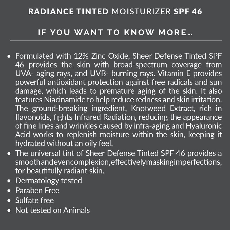 - The universal tint of Sheer Defense Tinted SPF 46 provides a smooth and even complexion, effectively masking imperfections, for beautifully radiant skin.