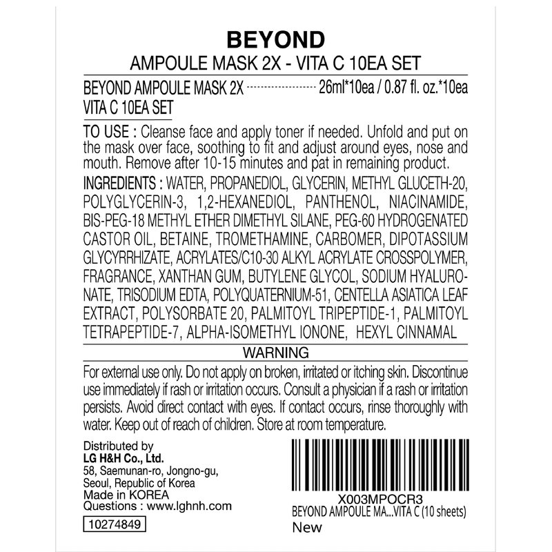 - DIFFERENTIATED FORMULA - BEYOND's Ampoule Mask 2X line provides targeted solutions for various skin concerns through differentiated formulae. "Ampoule Mask 2X with Vitamin C" comes in a clear, highly-concentrated formula developed to promote clearer and glowing skin without leaving a sticky residue.