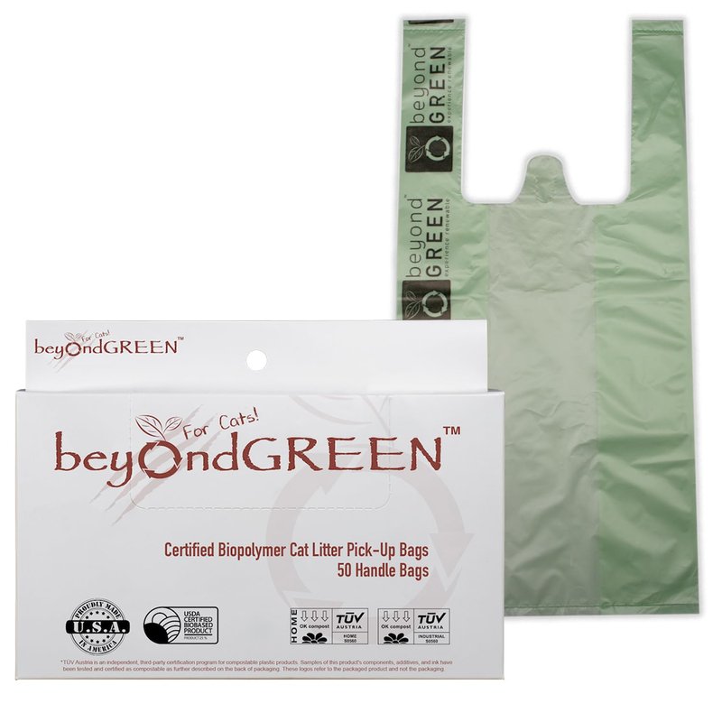Our plant-based biopolymer bags are an alternative to environmentally harmful plastics bags. SIZE: 8" w x 16" H Gusseted with handle. Can also be used for large dog waste NATURAL kitty litter poop bags, alternative to harmful plastic bags, green dog poop bags NO HARMFUL PLASTICS: Our Pet Waste Bags are Certified Biobased Material. Natural, certified compost & home compost - Made from Renewable Material CERTIFIED AS BIOBASED BY USDA. Certified by OK Compost, OK HOME Compost as per EN 13432 (European). WHY US: Here at beyondGREEN bags, our sole mission is to cut plastic pollution by offering our next generation technology of dog waste bags and cat litter bags as an eco-friendly alternative to the trillions of harmful plastic bags used each year. Made with natural, renewable material and packaged in recycled material, beyondGREEN's patented vegetable blend promotes minimized pollution and supports sustainable development goals. With a market flooded with green-washed plastics, beyondGREEN is the trusted alternative by offering certifications with USDA Bio based and EN13432 for Compost and Home Compost. beyondGREEN is a certified Green Business by Green America and is also a proud member of the environmental initiatives, Break Free from Plastic, Plastic Pollution Coalition, and Pet Sustainability Coalition. beyondGREEN believes in working beyond just providing a product by also contributing to powerful movements for positive environmental change. beyondGREEN Bags are more than just a product, they are a movement educating consumers on the effects their choices have on our environment, in hopes of leading them towards a future without plastics. Our passion for sustainability comes from our innermost care for the health of humans, pets and the environment.