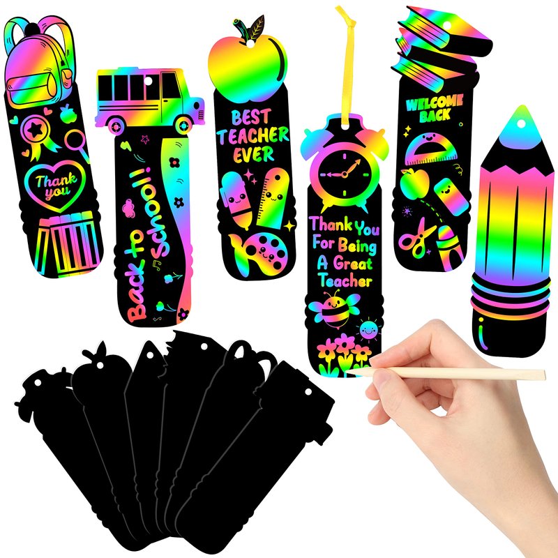 - EASY TO USE: Just scratch the black surface with a wooden stylus to reveal the rainbow base coat. Colored ribbons are included in the package, and there are small holes at the top of the bookmarks, and the bookmarks can be easily hung by passing the ribbons through the small holes.