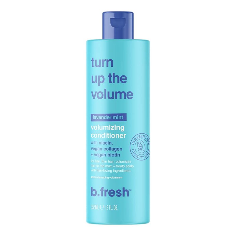 Conditioner with niacon, vegan collagen + vegan biotin. 100% vegan. Turn up the volume. For fine, thin hair. Volumizes hair to the max + treats scalp with hair-loving ingredients. Paraben free. Turn the volume up to the max. A conditioner for fine, thin hair types looking to turn it up a notch. Works to volumize hair to the max while treating the scalp with hair loving ingredients niacin, vegan collagen + vegan biotin + topped off with a fresh lavender mint scent. Scalp loving ingredients. bfresh.rocks. USA: 1800 914 3880. AUST: 1300 819 331. EU/UK: +31 (0) 2023 74700. EU RP: Marque of Brands BV, Toermalijnstraat 3 1812 RL Alkmaar, The Netherlands. UK RP: Marque of Brands Ltd. 2nd Floor, 168 Shoreditch High St. London E1 6RA, UK bfresh.rocks Cruelty free. Made in USA.