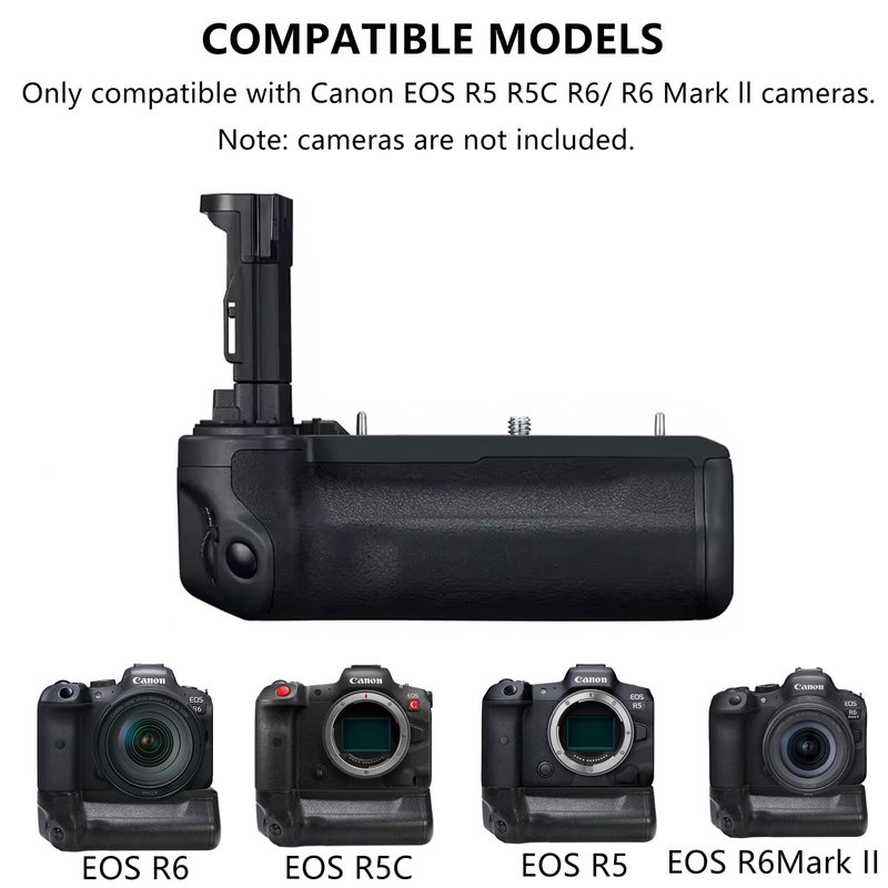 - 【COMPATIBILITY】The battery grip is compatible with Canon EOS R5 R5C R6 R6 Mark II cameras; 1/4-inch screw hole at the bottom allows you to mount the grip on tripod; Provides more battery capacity for your camera, effectively extending your shooting time.