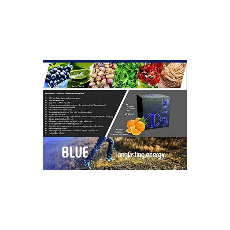 Blue Energy Blend delivers hours of natural, long-lasting energy with no adverse side effects. These convenient, single-serve packs easily move with you to power your active lifestyle, leaving you calm and alert throughout the day. Blue Energy Blend augments strength and endurance at the cellular level, increasing both stamina and performance. Potent antioxidants protect the body from damaging free radicals, while natural plant extracts increase metabolism, reduce muscle recovery time and inhibit inflammation, making Blue Energy Blend the perfect addition to your fitness routin