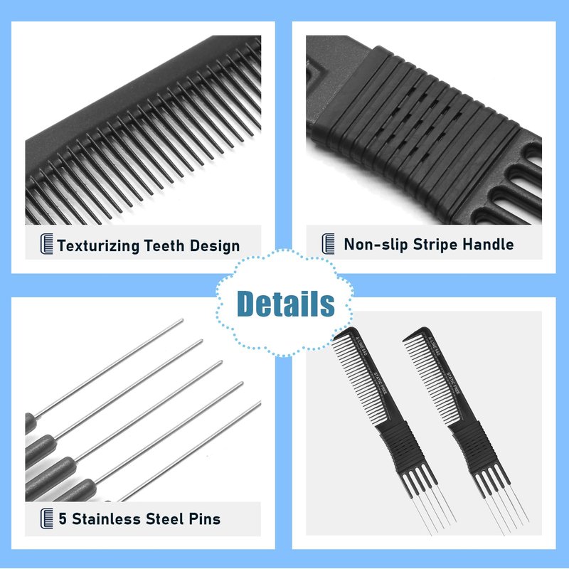 - 5 stainless steel pins: The 5 metal pins are designed with alternating length teeth and serrated edges to ensure that they tease the hair well, are strong and flexible, and make your hair shine again.