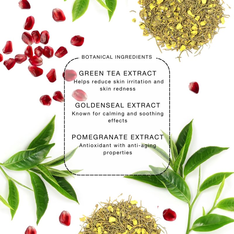 - ANTIOXIDANT HERBAL BLEND - Green Tea Leaf Extract is known for its anti-inflammatory properties that can help reduce skin irritation and skin redness. Horsetail Extract is an antioxidant, loaded with vitamin B5, which is a powerful humectant. Goldenseal Extract and Hops Extract helps to fight inflammation and redness and are praised for their skin calming and soothing effects. Pomegranate Fruit Extract is a known antioxidant with anti-aging and calming properties