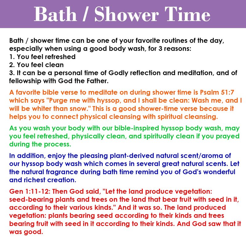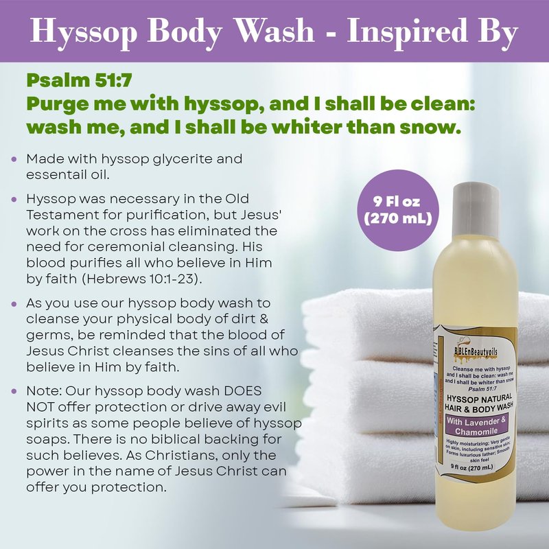 - Spiritual Significance: As you cleanse your physical body with our hyssop body wash, reflect on the spiritual significance of hyssop as a symbol of purification & forgiveness. Let the cleansing ritual remind you of the redeeming power of Jesus Christ's blood.