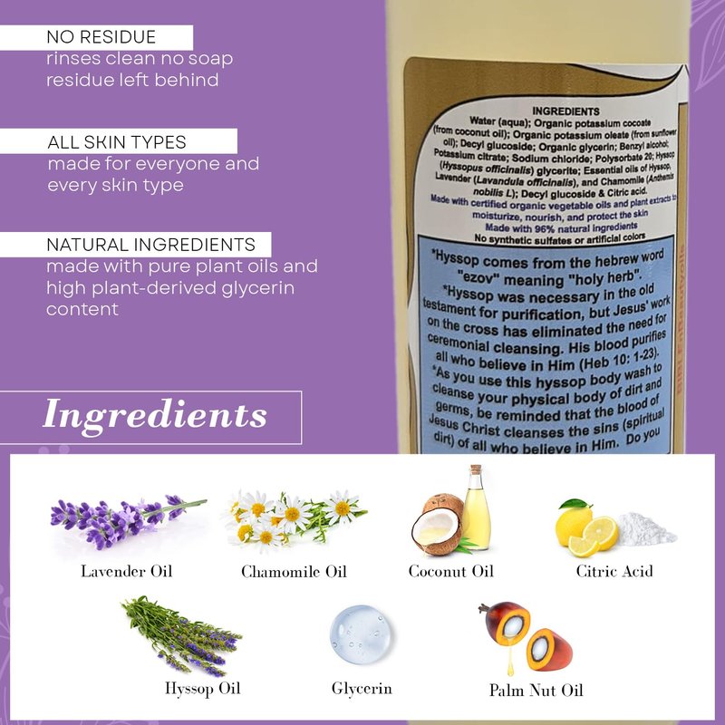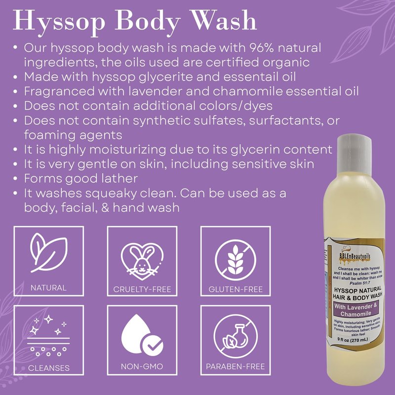 - Holistic Cleansing Experience: Our hyssop body wash nourishes both your body and soul. Let each wash be a moment of reflection and renewal in your spiritual journey.
