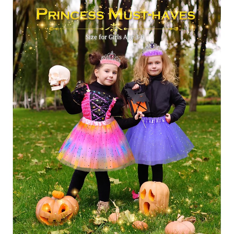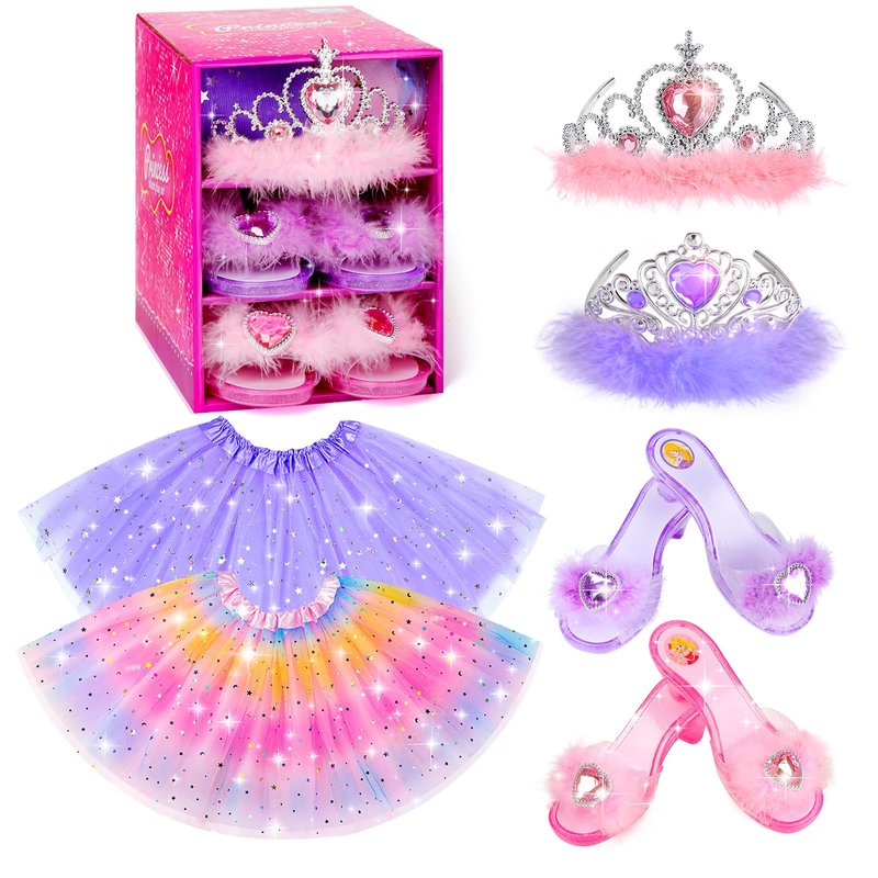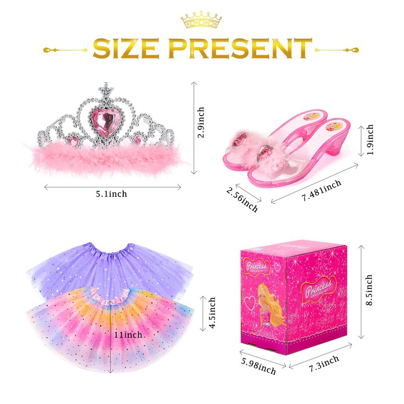 - Perfect Dress Up Gift: Girls dress up costumes for play with 2 sets of matching princess crowns for little girls, tutu skirts and princess shoes in very nice gift box. Toddler dress up clothes for girls, super cute and super fun for every little princess! Does your little girl love to walk in shoes that have heels? This is the perfect gift for your little one cause she no longer walks in mom's high heels.