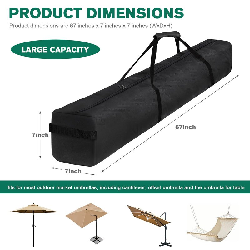 - [Dimension]- 67 inch x7 inch x7 inch /170x17x17cm(WxDxH), fits for most outdoor market umbrellas, including cantilever, offset umbrella and the umbrella for table.