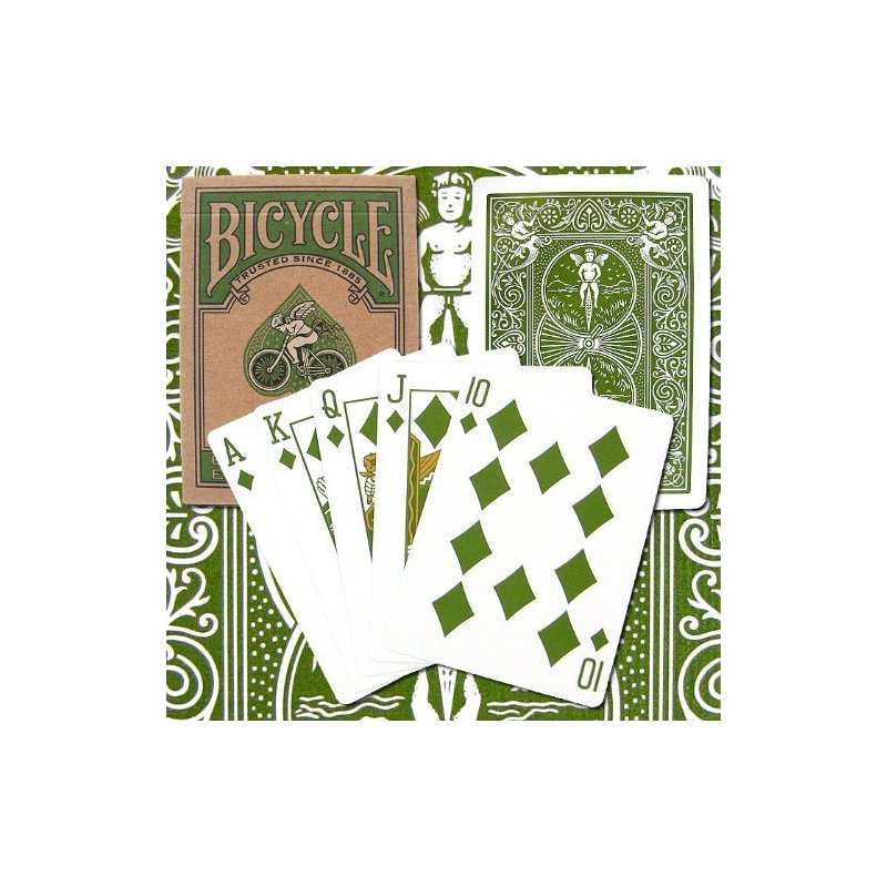 One dozen decks Bicycle Eco Playing cards. Bicycle Eco Edition playing cards are made with a fully-recyclable case and deck. The cards are made with sustainable forest papers, starch-based laminating, and vegetable-based inks. Made in the USA.
