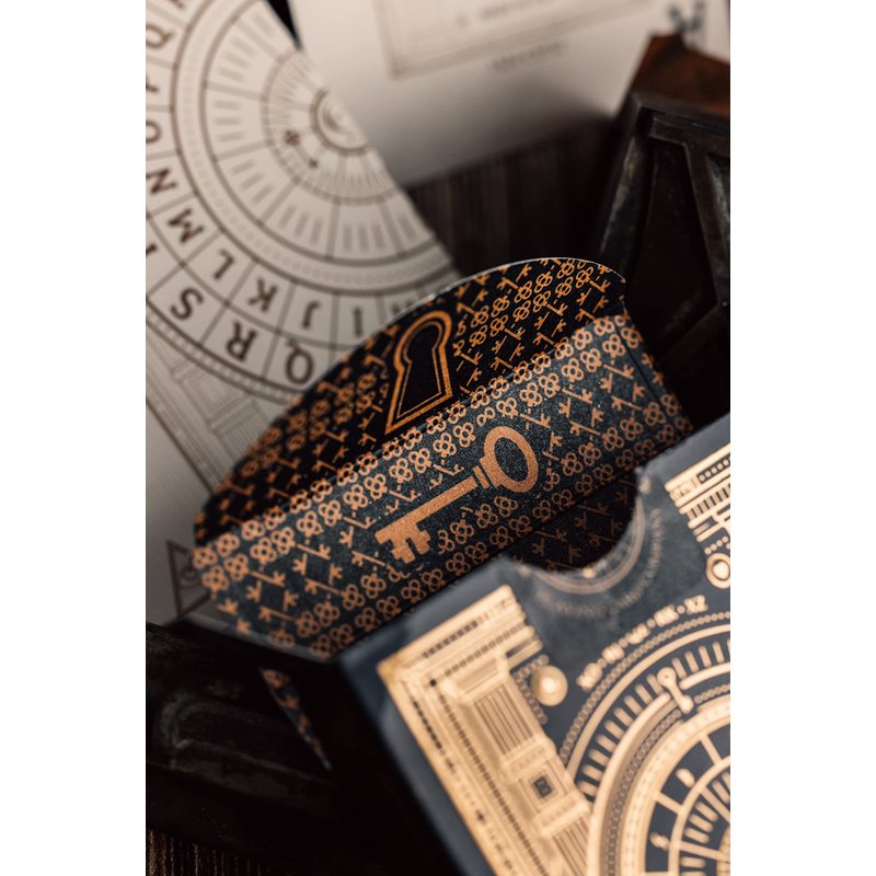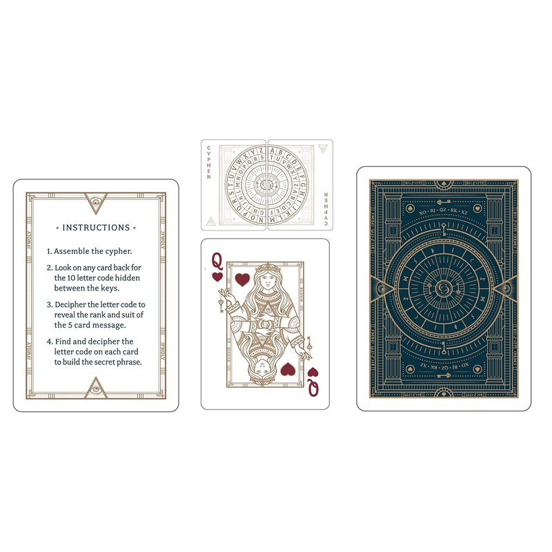 - The card backs and faces feature an encrypted message that collectors can decipher. A translation key is included on the ad cards inside the deck!