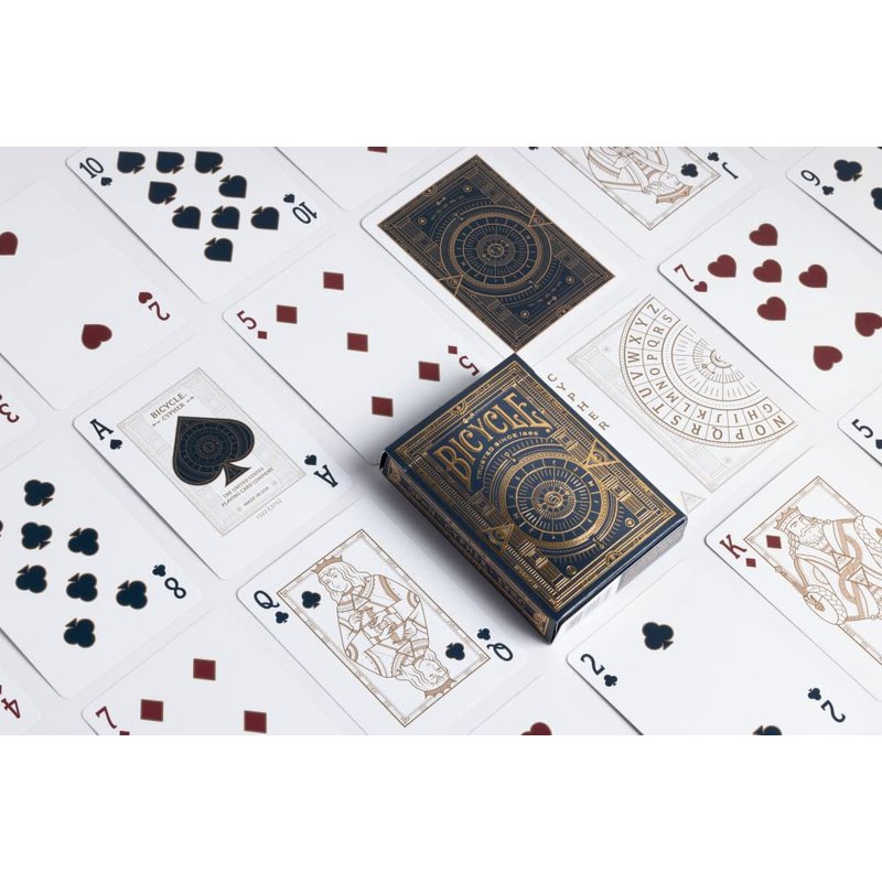 - Custom-designed tuck, court cards, and card backs. Featuring a luxurious gold foil and embossing on the tuck and dark blue and gold designs in the deck.