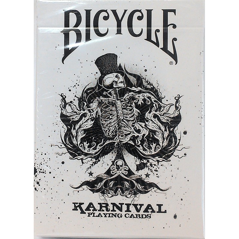 The Karnival Deck was the first custom deck produced by Big Blind Media, becoming the first in their signature series by the same name. The artwork is by a French artist named Sam Hayles. The cards have very subtle one-way backs. Comes with two custom jokers (one of which features a reveal), a custom Ace of Spades, and a double backed gaff card.