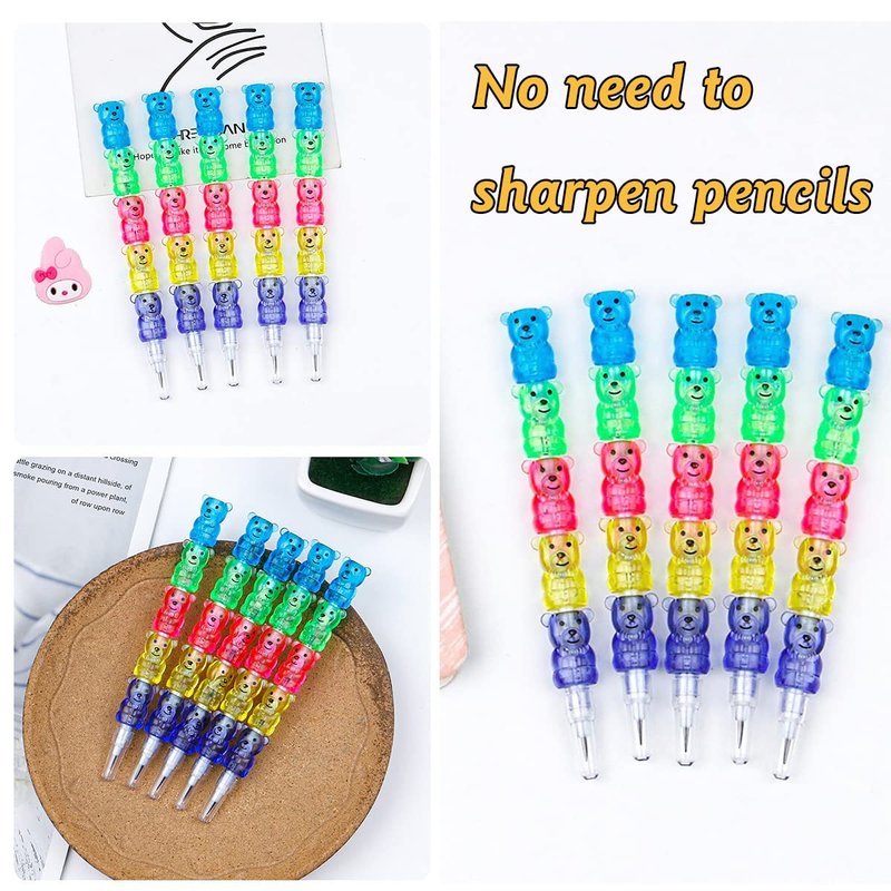 - 🧸Novel Design - Each little stackable pencil has a cute bear shape and 5 different colors of red, purple, green, blue and yellow, just like the gummie bears. The overall look is very novel and cute and will add more colors to your daily life.