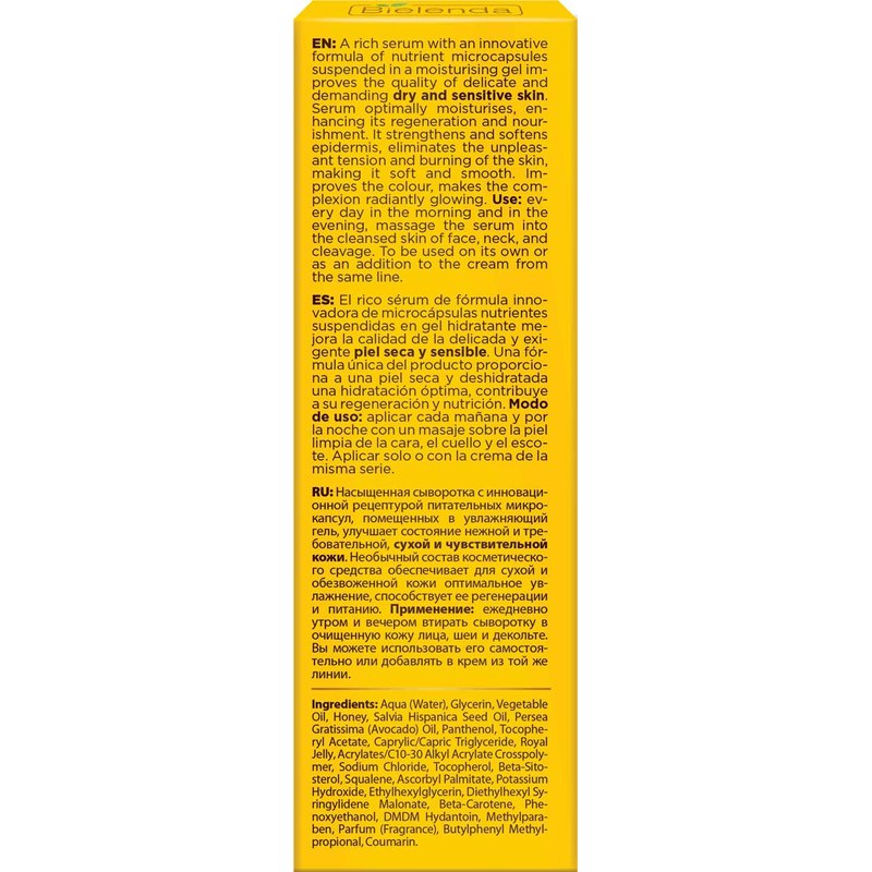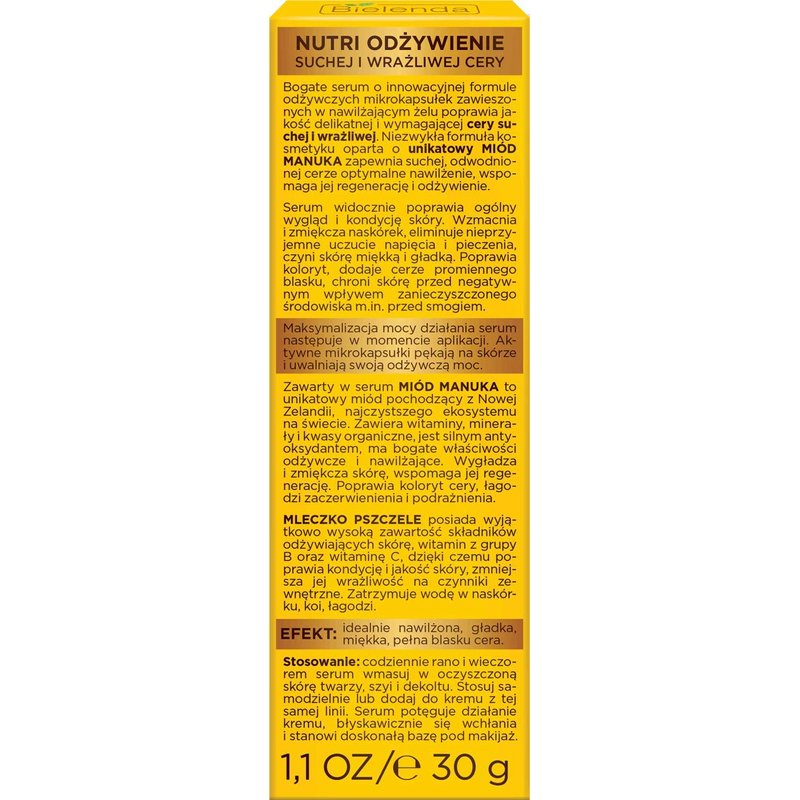 Bielenda MANUKA HONEY NUTRI ELIXIR Nourishing & Moisturising Face Serum for Day / Night 30ml A rich serum with an innovative formula of nutrient microcapsules suspended in a moisturizing gel improves the quality of delicate and demanding dry and sensitive skin. The unusual formula of the cosmetic based on the unique Manuka Honey provides dry, dehydrated skin with optimal hydration, supports its regeneration and nutrition. The serum visibly improves the overall appearance and condition of the skin. Strengthens and softens the epidermis, eliminates the unpleasant feeling of tension and burning, makes the skin soft and smooth. It improves the color, gives the skin a radiant glow, protects the skin against the negative effects of a polluted environment, among others against smog. Maximization of the serum's performance takes place at the time of application. Active microcapsules burst on the skin and release their nutritional power. The honey Manuka contained in the serum is a unique honey from New Zealand, the purest ecosystem in the world. It contains vitamins, minerals and organic acids, is a powerful antioxidant, has rich nutritional and moisturizing properties. It smoothes and softens the skin, supports its regeneration. It improves the skin tone, soothes redness and irritation. Bee Milk has an extremely high content of skin nourishing ingredients, B vitamins and vitamin C, which improves the condition and quality of the skin, reduces its sensitivity to external factors. Stops water in the epidermis, soothes, soothes. Effect: Perfectly moisturized, smooth, soft and radiant complexion.