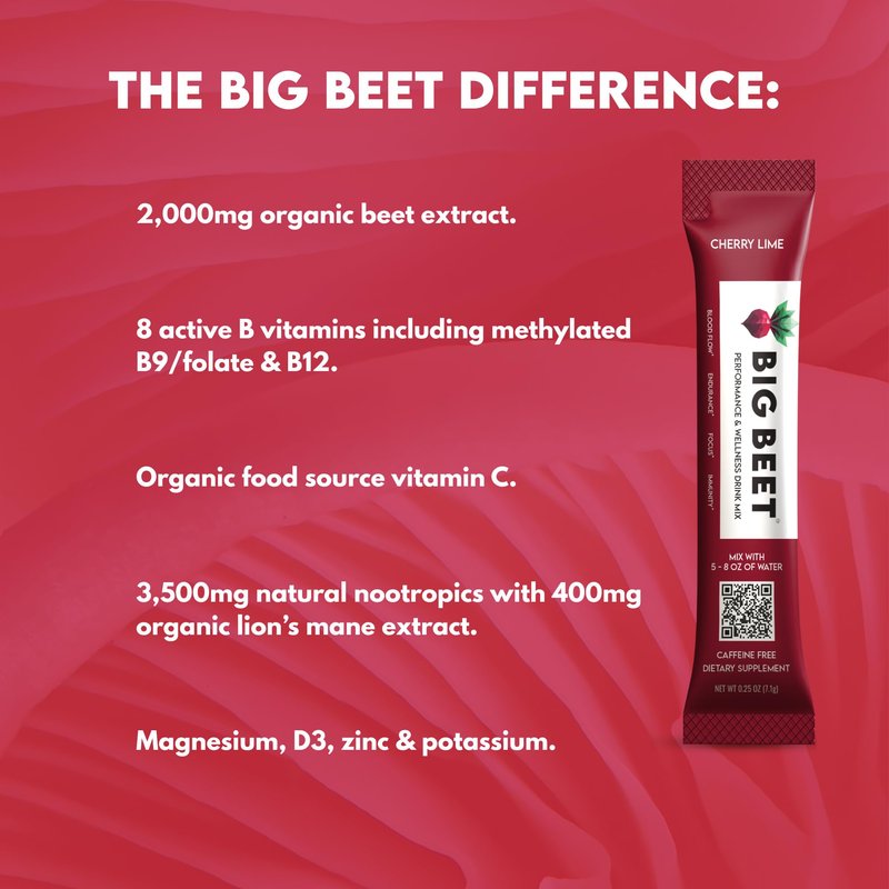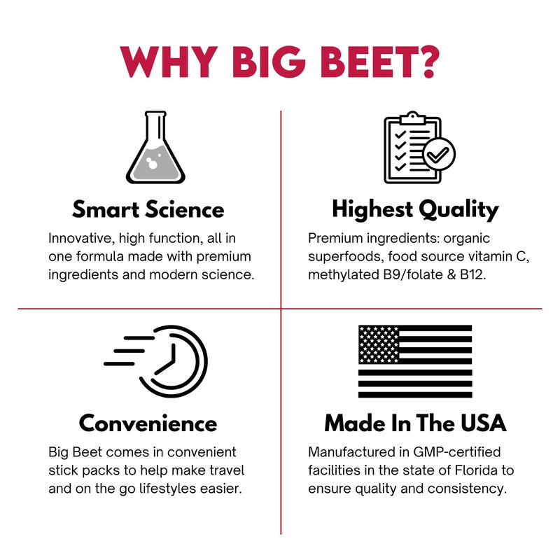 Powered by ancient nutrition and modern science, Big Beet delivers a level of functionality yet to be seen in the powder drink mix market. No expense was spared while sourcing ingredients for Big Beet. Instead of cutting corners to increase profits, Big Beet is focused on ultra-clean premium ingredients delivered in functional doses. Propelled by this focus, we created a premium and high functioning blend the world has not yet seen.