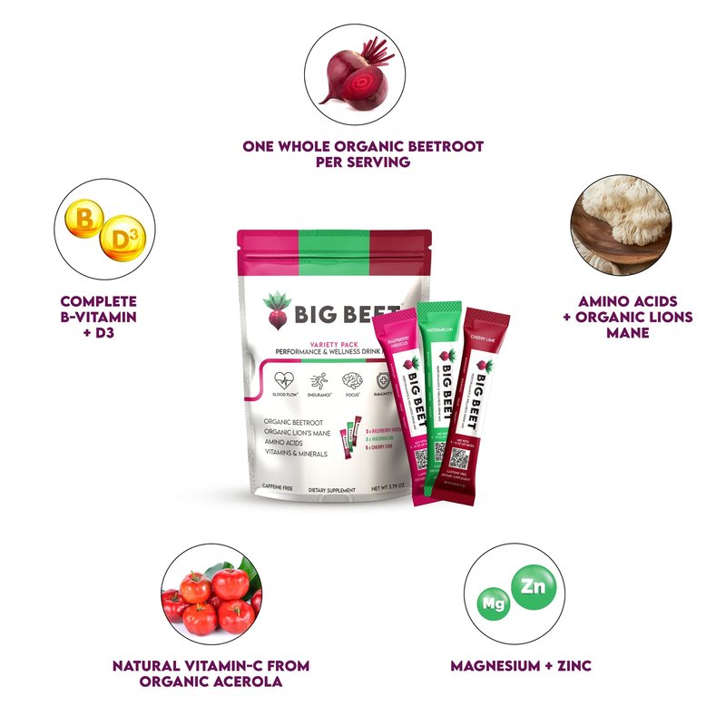 Big Beet Performance & Wellness Drink Mix | 3 Flavor Variety Pack | Organic Superfoods | Organic Nootropics | Zero Added Sugar | 15 ct.