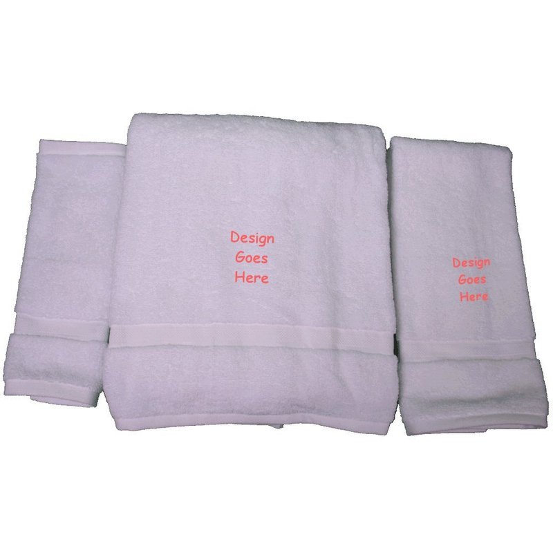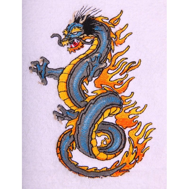 100% cotton thick terry bath towel set. Embroidered on the white towels is a blue dragon with flaming scales. The design is embroidered with long lasting color fast polyester thread. Machine washable. Included in the set is: 1 embroidered bath towel, 30 x 54 inches 1 embroidered hand towel, 16? x 29? 1 plain wash cloth, 13? x 13?