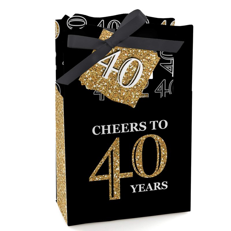 - Adult 40th Birthday Favor Boxes INCLUDES 12 black and gold party favor bags, 12 gift tags and coordinating satin ribbon. Classic favor boxes are a party must-have. Black and gold theme party supplies are great for a birthday party. f