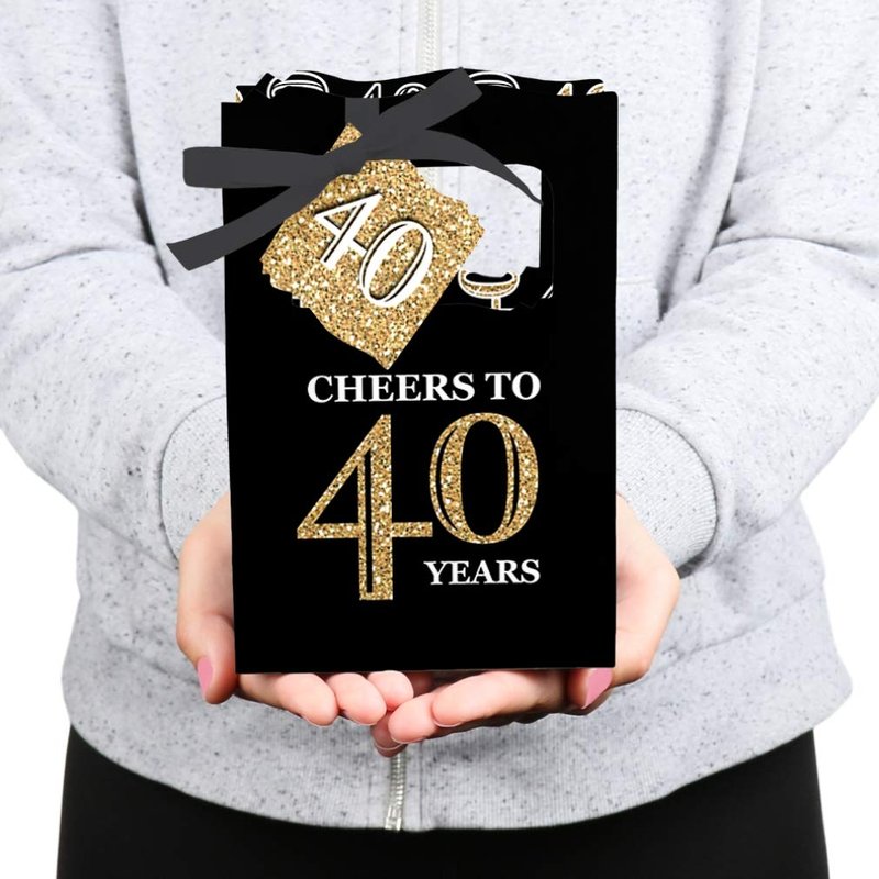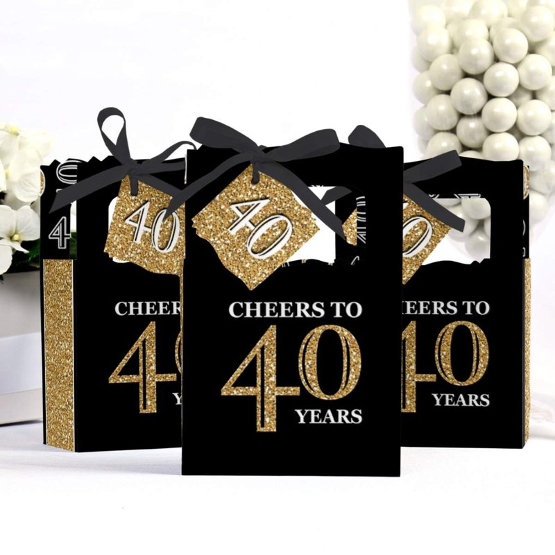 - PREMIUM PARTY FAVOR BOXES: Adult 40th Birthday - black and gold party favor boxes are professionally printed on heavy-duty cardstock paper with a photo-like shine. They are hand-folded and individually inspected, then carefully packaged. Favor boxes will arrive flat, partially assembled. Finishing assembly is required but it is easy. Once assembled, add the black, white, and gold gift tag with the included ribbon for perfect party favors!