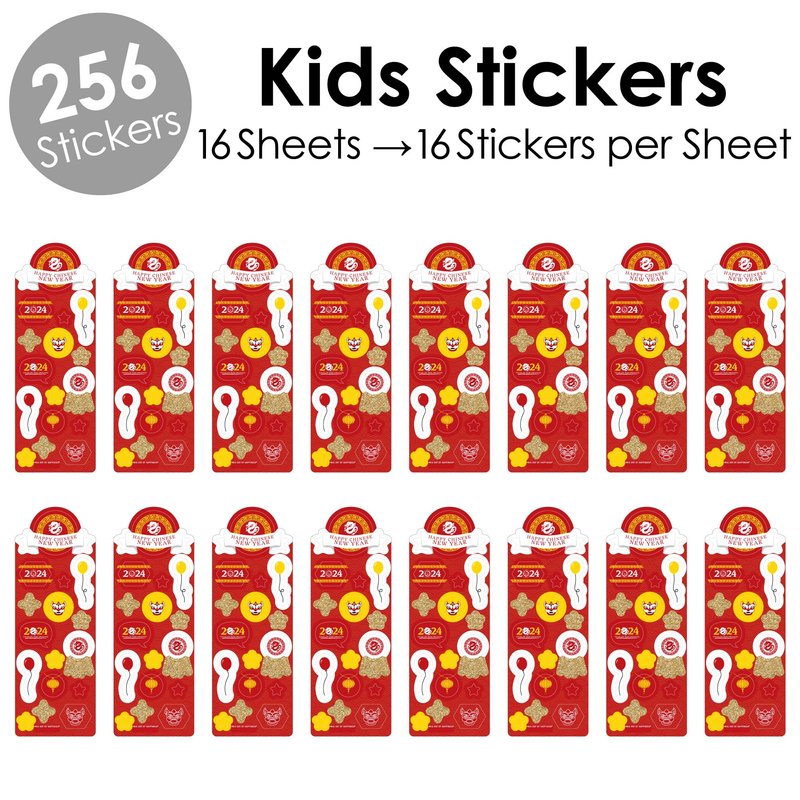 - Chinese New Year Favor Kids Stickers Includes 16 matching sticker sheets with 16 stickers per sheet for total of 256 stickers.