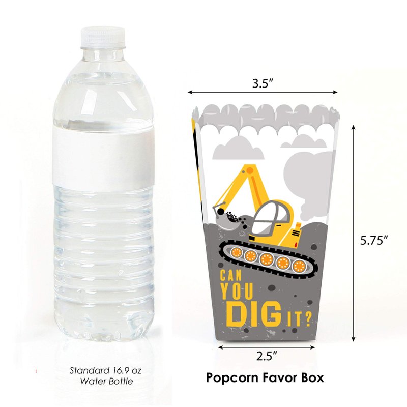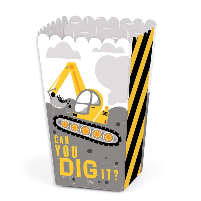 - PREMIUM PARTY FAVOR BOXES: Dig It - Construction Party Zone party treat boxes are professionally printed on heavy-duty cardstock paper with a photo-like shine. They are hand-folded and individually inspected, then carefully packaged. Popcorn boxes will arrive flat. Easy assembly is required.