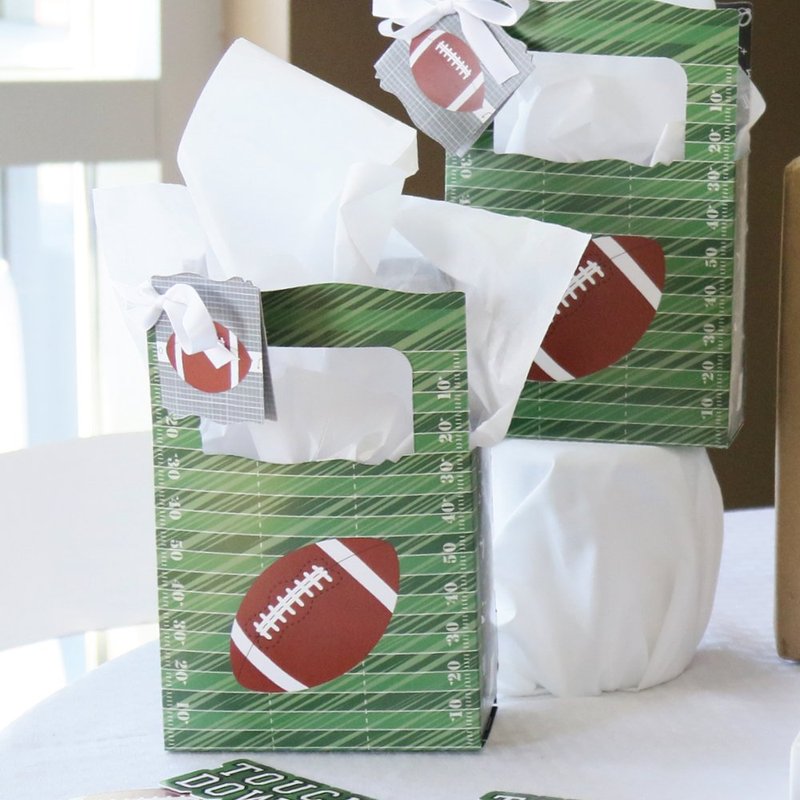 - End Zone Favor Boxes INCLUDES 12 football party favor bags, 12 gift tags and coordinating satin ribbon. Classic favor boxes are a party must-have. Football theme party supplies are great for a baby shower, birthday or graduation party.