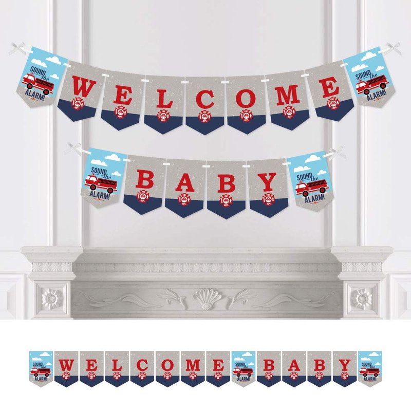 - Fire Up Fire Truck Bunting Banner is an impressive baby shower decoration for your party. Baby Shower Bunting Banner Decoration Kit INCLUDES WELCOME BABY letter pennants, firefighter themed pennants, satin ribbon and non-marking wall mounts for hanging.