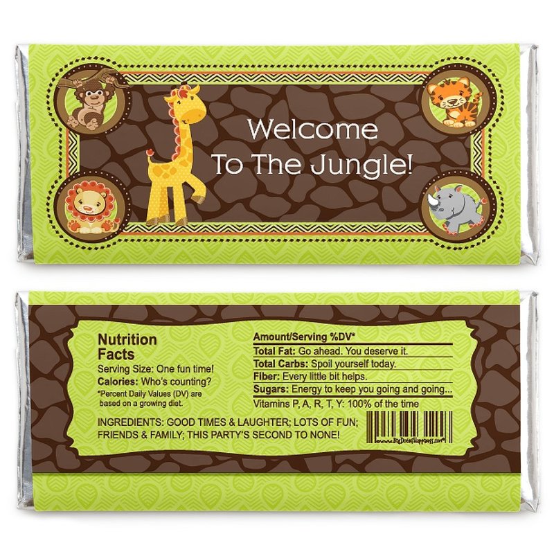 - MADE IN THE USA: Funfari - Fun Safari Jungle - Candy Bar Wrapper Baby Shower or Birthday Party Favors are designed and manufactured at our Wisconsin facility using materials that are Made in the USA. Please Note: Candy bars are not included but are available at your local grocery store. Candy bar wrappers will fit standard 1.55 oz chocolate bars.
