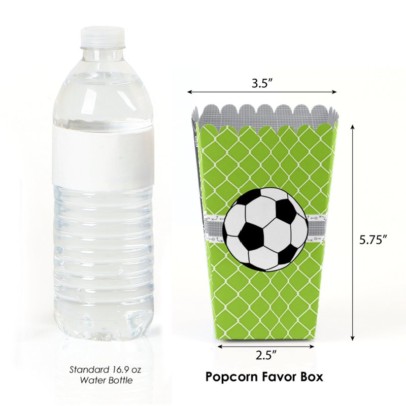 - GOAAAL! - Soccer party favor popcorn treat boxes SIZE 5.75 inches tall x 3.5 inches square at the top. The unique design and large size makes these 12 soccer ball popcorn boxes a must-have for any baby shower or birthday party.