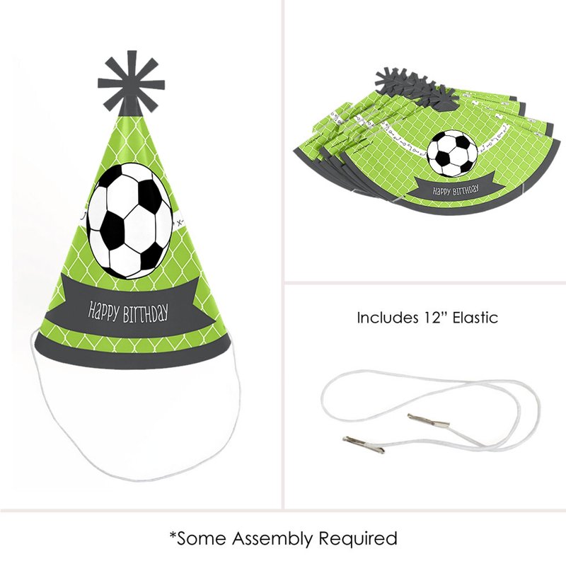 - GOAAAL! - Soccer Party Hats INCLUDES 8 cone-shaped soccer party hats for adults with decorative top and elastic chin straps. GOAAAL! - Soccer party hats are a larger size but will fit both children and adults. Some easy and quick assembly required.