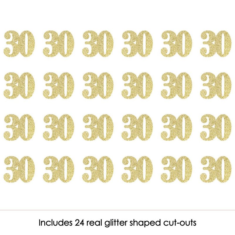 - Gold Glitter Number 30 Confetti INCLUDES 24 no-mess real gold glitter cut-out number 30s for a 30th birthday party or anniversary. Number 30 gold confetti is cut from no-mess glitter paper, making them perfect for table decorations and ensuring easy clean up.