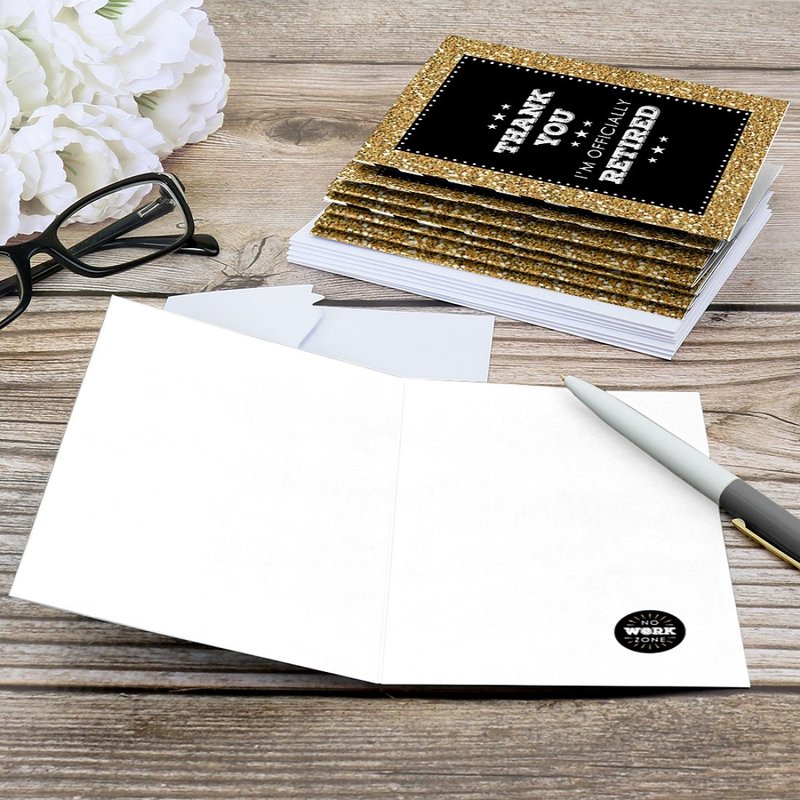 - PREMIUM THANK YOU CARDS: Happy Retirement thank you cards are professionally printed on heavy-duty card stock paper with a photo-like shine. They are hand-folded and individually inspected, then carefully packaged with our exclusive squiggle flap envelopes, making this retirement stationary set a must-have for retirement party.
