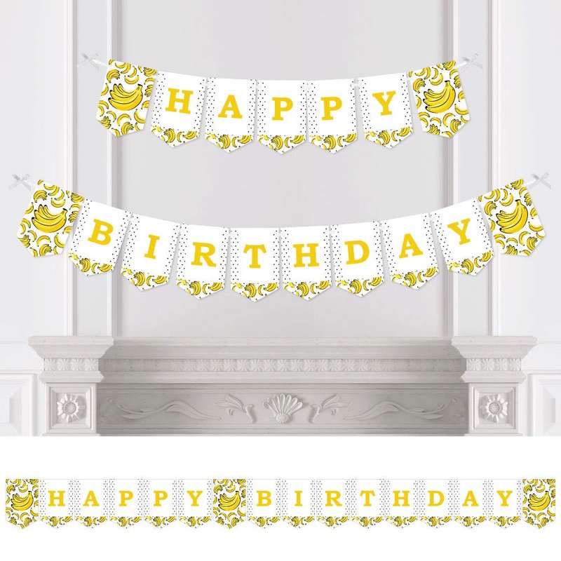 - Let’s Go Bananas Bunting Banner is an impressive birthday decoration for your party. Banana Birthday Bunting Banner Decoration Kit INCLUDES Let’s Go Bananas HAPPY BIRTHDAY letter pennants, banana themed pennants, satin ribbon and non-marking wall mounts for hanging.