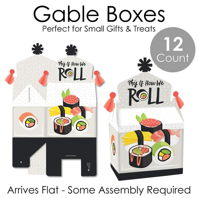 - Gable Boxes INCLUDE: 12 Let’s Roll - Sushi-themed goodie party favor boxes. Each box SIZE measures 4.25 inches length x 3 inches width x 7.75 inches height. Gable favor boxes are ideal for small gifts and treats that are under 3.5 inches tall (height for storing items in closed box).
