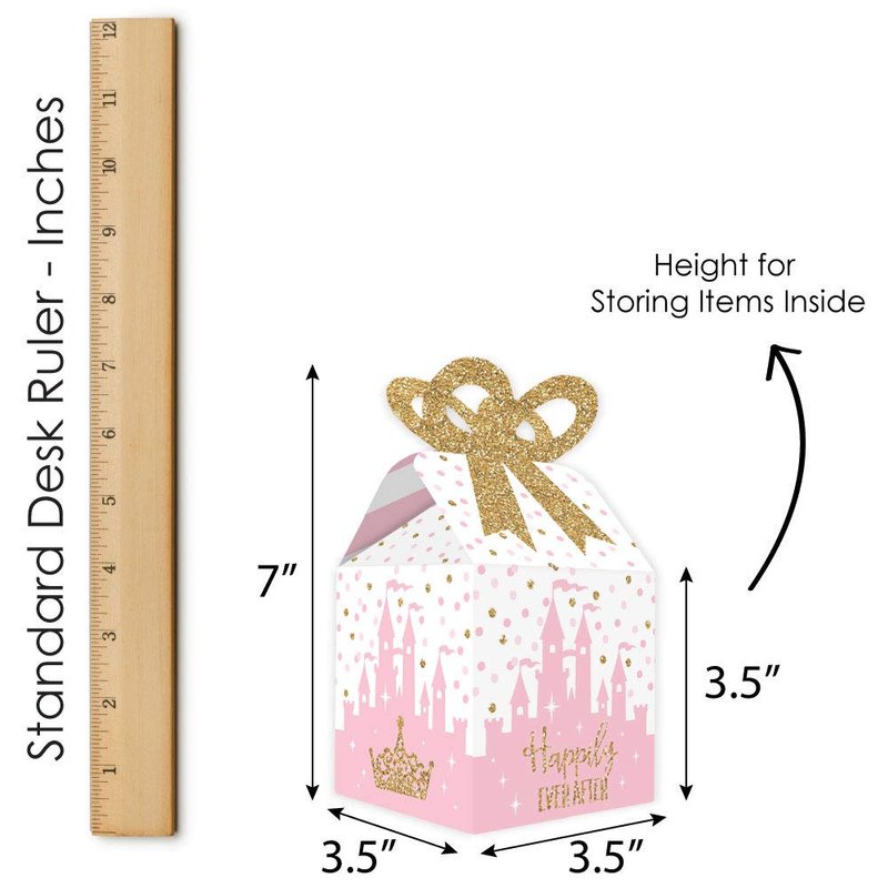 - Bow Boxes INCLUDE: 12 Little Princess Crown-themed square favor gift boxes. Each box SIZE measures 3.5 inches length x 3.5 inches width x 7 inches height. Bow boxes are ideal for small gifts and treats that are under 3.5 inches tall (height for storing items in closed box). When assembled and closed, each box creates a 3D paper bow-shaped top with a square bottom.