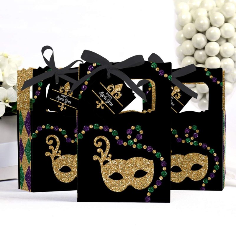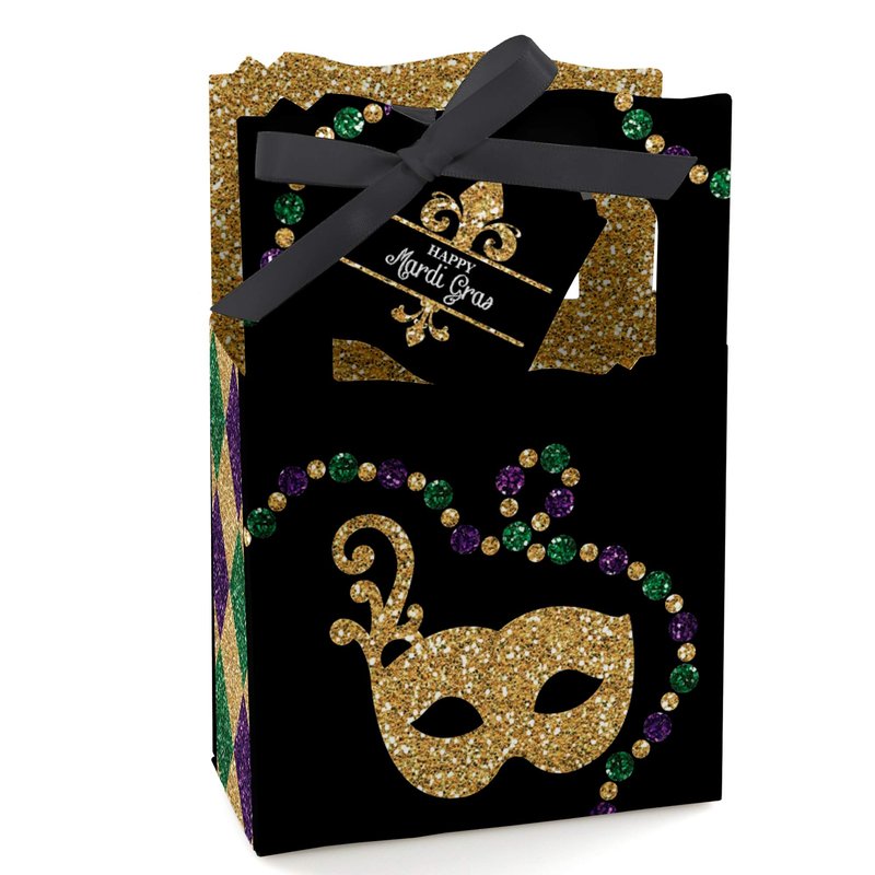 - Masquerade Favor Boxes INCLUDES 12 Mardi Gras party favor bags, 12 gift tags and coordinating satin ribbon. Classic favor boxes are a party must-have. Fat Tuesday theme party supplies are great for a Mardi Gras party.