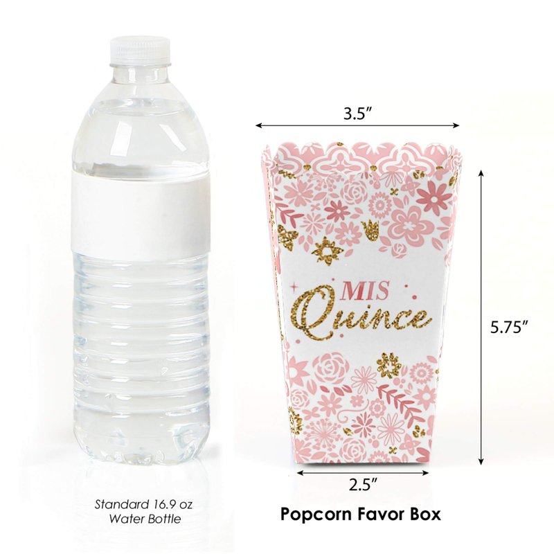 - Mis Quince Anos favor popcorn treat boxes SIZE 5.75 inches tall x 3.5 inches square at the top. The unique design and large size makes these 12 sweet 15 popcorn boxes a must-have for any birthday party.