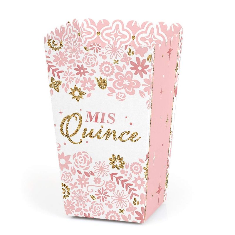 - Mis Quince Anos Favor Popcorn Treat Boxes INCLUDES 12 sweet 15 party favor boxes. Mis Quince Anos treat boxes are perfect for any event. The blush and gold theme is great for a birthday party.