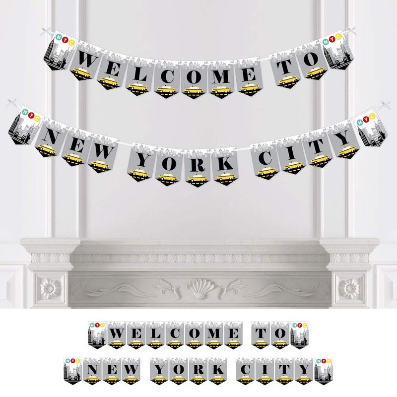 - NYC Cityscape Bunting Banner is an impressive New York City party decoration for your party. Taxi Bunting Banner Decoration Kit INCLUDES WELCOME TO NEW YORK CITY letter pennants, NYC subway themed pennants, satin ribbon and non-marking wall mounts for hanging.