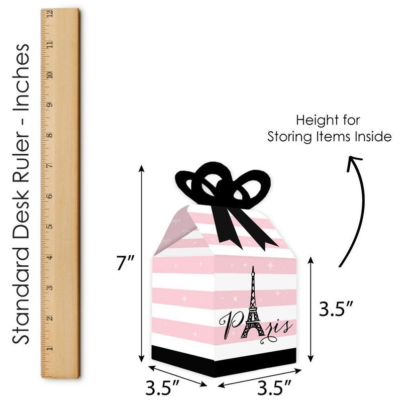 - Bow Boxes INCLUDE: 12 Paris, Ooh La La-themed square favor gift boxes. Each box SIZE measures 3.5 inches length x 3.5 inches width x 7 inches height. Bow boxes are ideal for small gifts and treats that are under 3.5 inches tall (height for storing items in closed box). When assembled and closed, each box creates a 3D paper bow-shaped top with a square bottom.