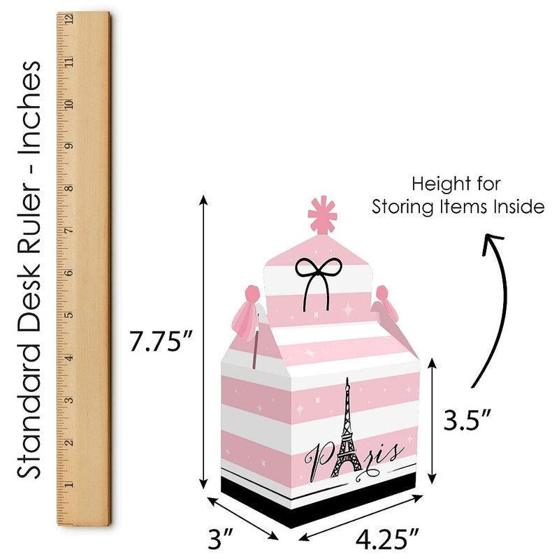 - Gable Boxes INCLUDE: 12 Paris, Ooh La La-themed goodie party favor boxes. Each box SIZE measures 4.25 inches length x 3 inches width x 7.75 inches height. Gable favor boxes are ideal for small gifts and treats that are under 3.5 inches tall (height for storing items in closed box).