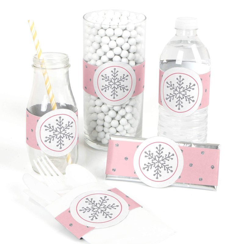 - EASY PARTY DECORATIONS: Pink Winter Wonderland DIY Holiday, Baby Shower or Birthday Party Wrapper Favors make it easy to style a coordinated event. Wrap candy bars, treat containers and snack bags in these fun favor wraps. They also make adorable Pink Winter Wonderland table decorations when you wrap apothecary jars at your candy buffet and centerpiece containers. Or, use them at beverage labels and napkin rings for easy party decorations in the snowflake theme!