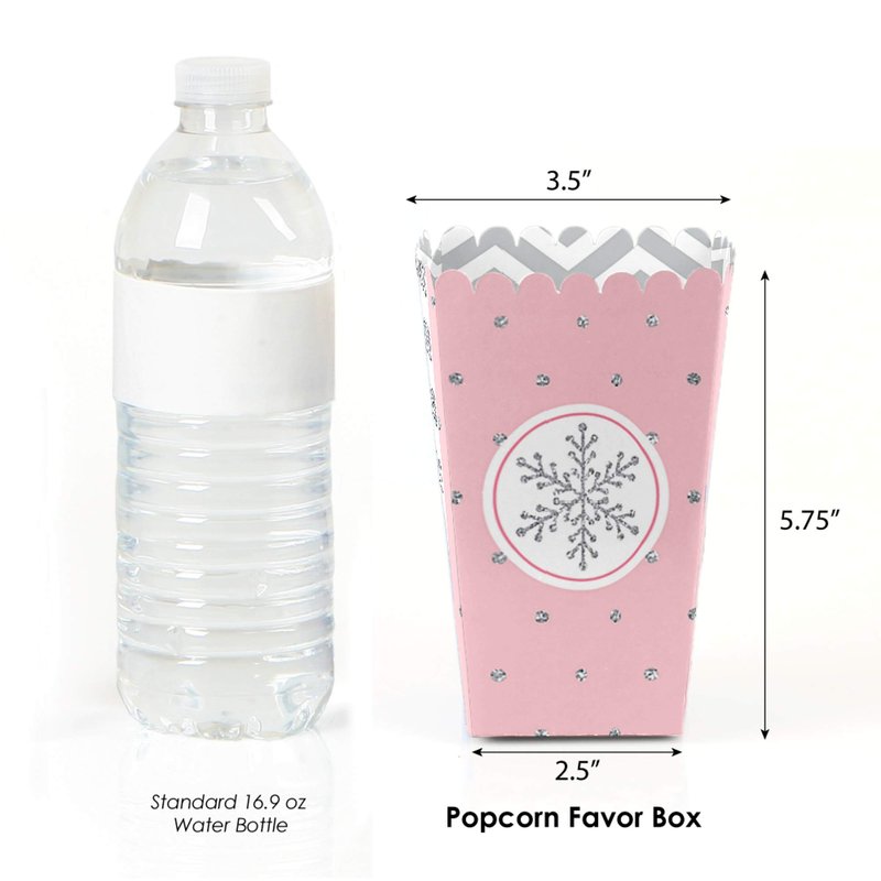 - Pink Winter Wonderland favor popcorn treat boxes SIZE 5.75 inches tall x 3.5 inches square at the top. The unique design and large size makes these 12-little pink snowflake popcorn boxes a must-have for any holiday, baby shower or birthday party.