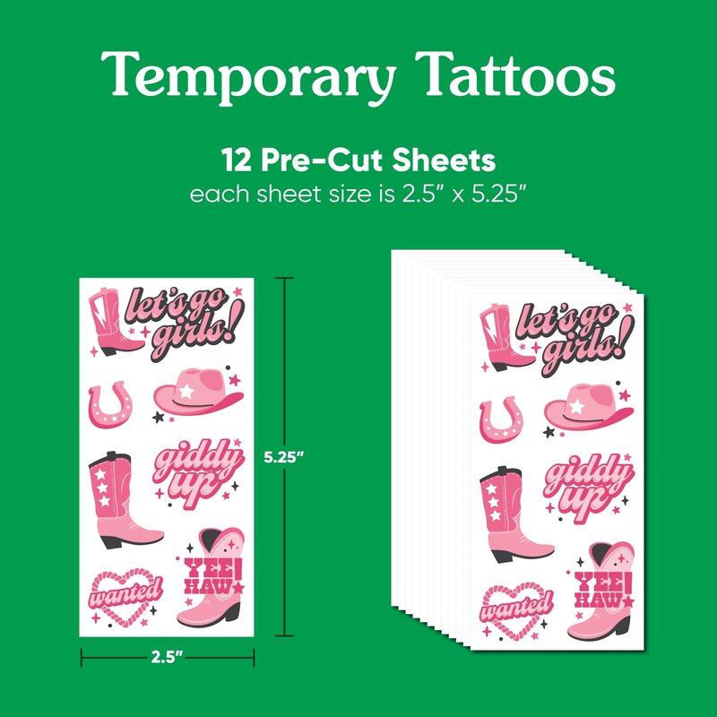 Here for a good time, not a long time - get ready to girls night with excitement at your next birthday bash with Big Dot of Happiness Rodeo Cowgirl Temporary Tattoos! Our set includes 12 pre-cut sheets of awesome western designs, perfect for a party to remember. These fun and pink tattoos make fantastic party favors, adding a party cheers touch to any celebration or create a tattoo station at your event. Easy to apply and remove, they're a hit with the girls. Whether you're decorating for a yeehaw themed party or looking for the perfect favor kit, these tattoos are sure to make your party a rodeo success! The bday tattoo favors are pre-cut and printed on skin-safe material. Easy to use, make sure your skin is clean and dry before applying your chosen tattoo art design with a damp cloth. Then, let your temporary tattoo air dry before showing it off to the world!